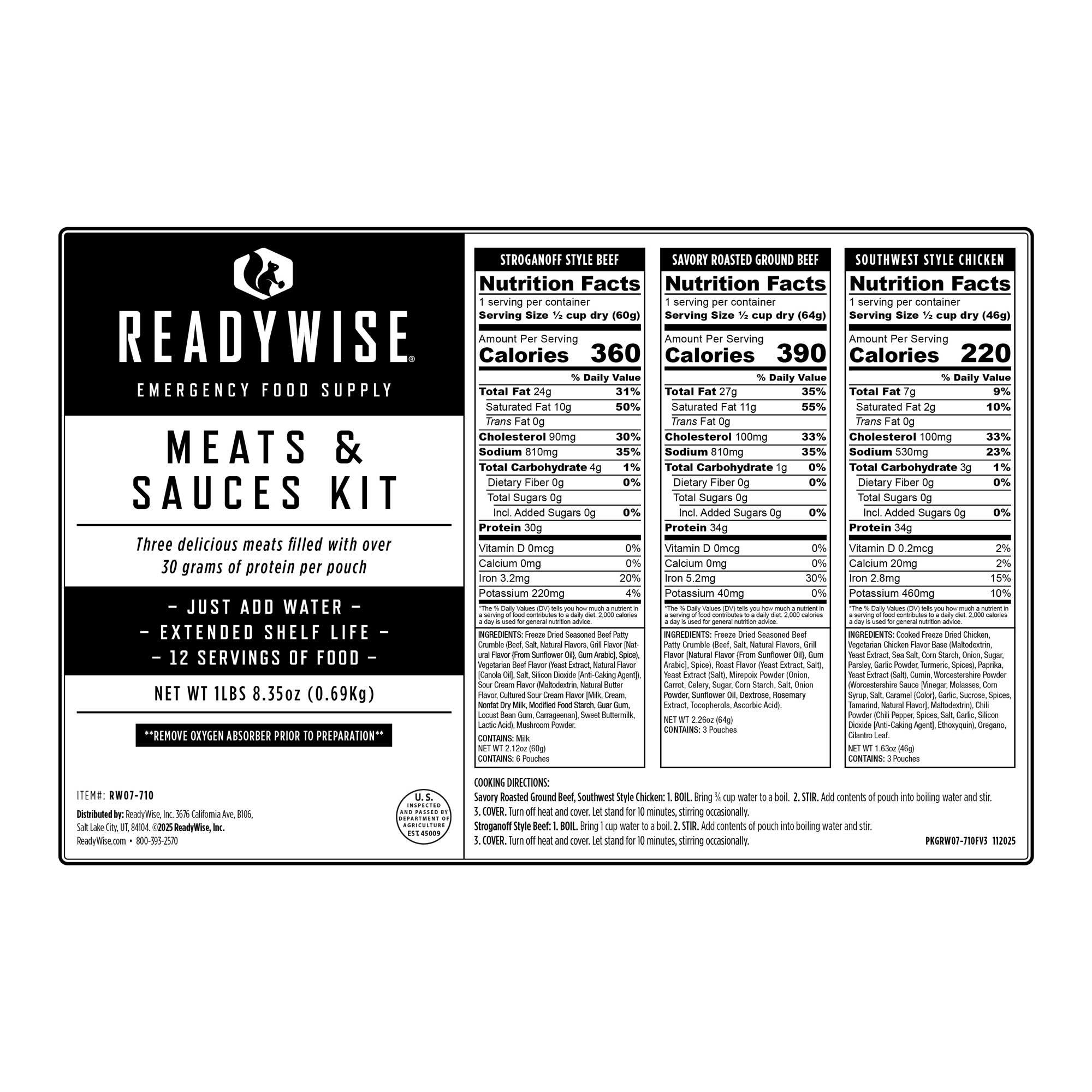 Fuel your adventures or emergency supply with hearty, protein-packed meals you can count on. The ReadyWise Meats & Sauces Kit includes three delicious entrees — Southwest Style Chicken, Stroganoff Style Beef, and Savory Roasted Ground Beef — with over 30 grams of protein per serving. Just add water for a satisfying, ready-to-eat meal anytime, anywhere.
